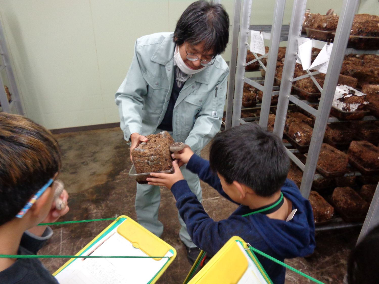 最初に、きのこ栽培の一連の流れを見学した後、シイタケやアラゲキクラゲの収穫を体験しました。参加した児童からは、きのこ栽培で気を付けることは何か、一番大きいきのこは何か等、様々な質問が出され、きのこのことを知ってもらう良い機会となりました。
