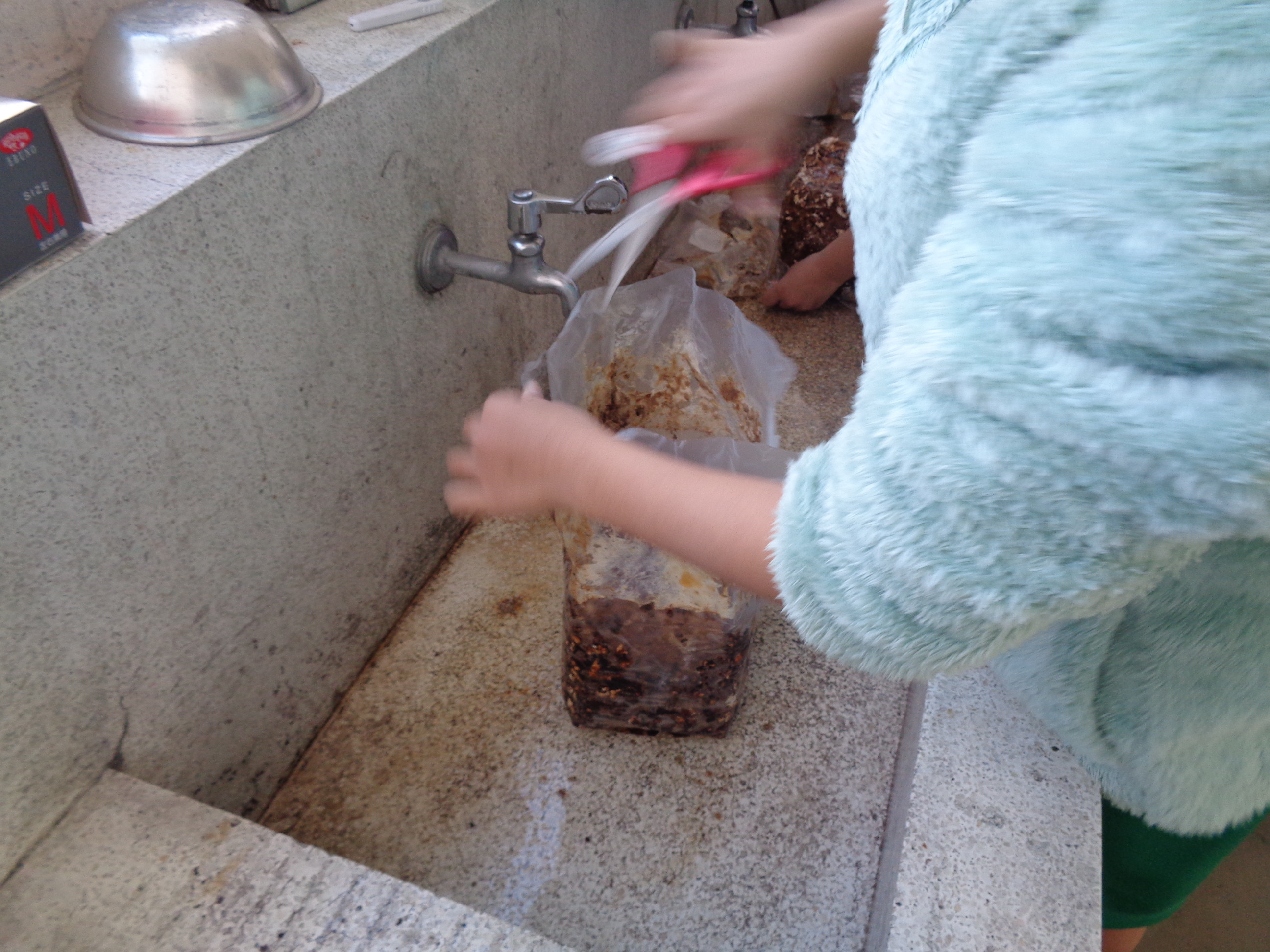 きのこに関する講義を行った後、シイタケ菌床の管理方法について説明し、児童1人につき1個ずつ発生処理を行ってもらいました。